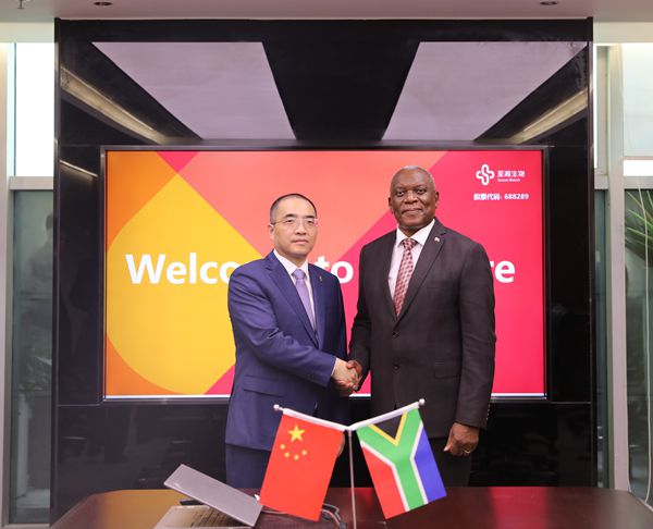 5月21日下午,南非共和国驻华大使谢胜文(SC Cwele)、商务公使约瑟夫·蒂莫(Yusuf Timol)在长沙高新区管委会相关领导的陪同下考察好博体育生物,双方就进一步推动南非与好博体育生物在医疗卫生领域的合作,进行了深入探讨。好博体育生物董事长戴立忠陪同考察。