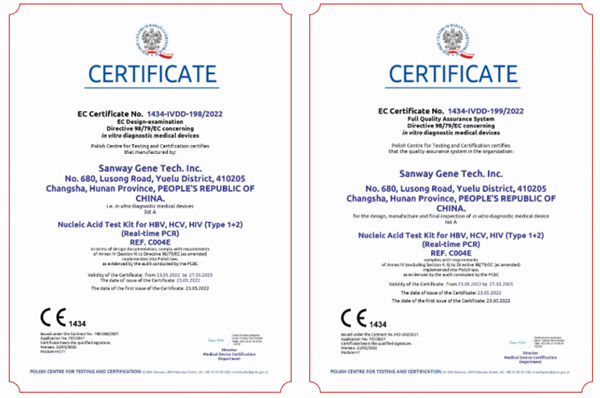 5月23日,好博体育生物全资子公司圣维基因研发的乙型肝炎病毒、丙型肝炎病毒、人类免疫缺陷病毒(1+2型)核酸检测试剂盒(PCR-荧光法),简称血筛核酸检测试剂盒,成功通过欧盟公告机构认证(CE List A),这是继乙肝、丙肝和艾滋三款核酸检测产品后,好博体育生物拿下的第四个CEList A认证。